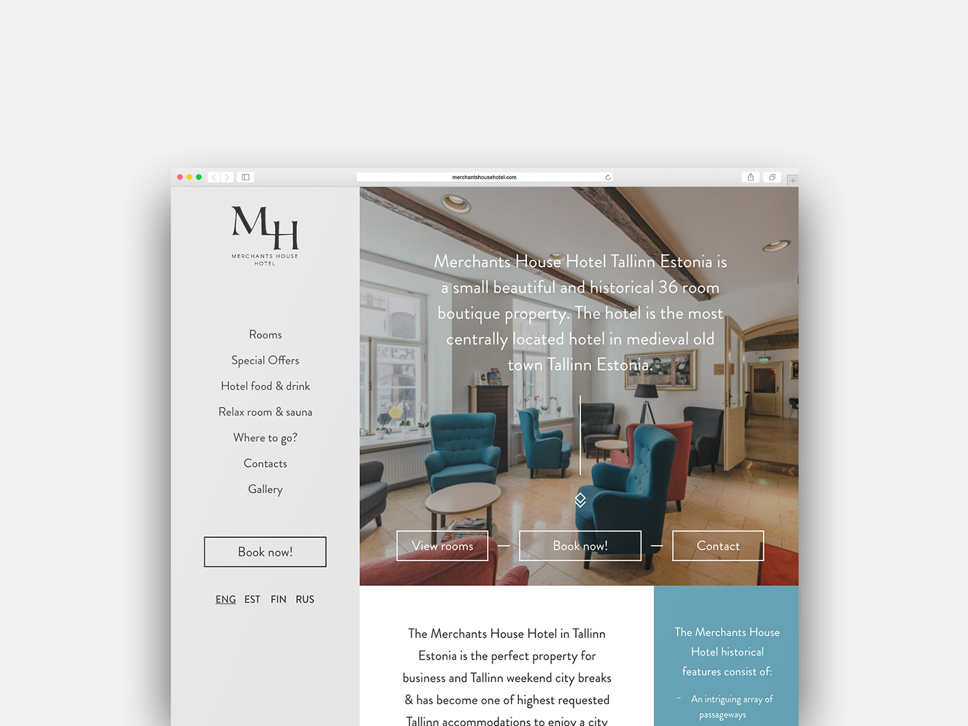 We created a new website and updated the brand for a unique boutique hotel in the old town of Tallinn. The distinctive feature of the website is the sliding side menu, which was quite challenging to build, but we quite like the end result. The website is built on Wordpress platform and uses beds24 integration for bookings. We also cooperated with photographer Tõnu Tunnel for the new photos of the hotel and it's rooms. https://www.merchantshousehotel.com/